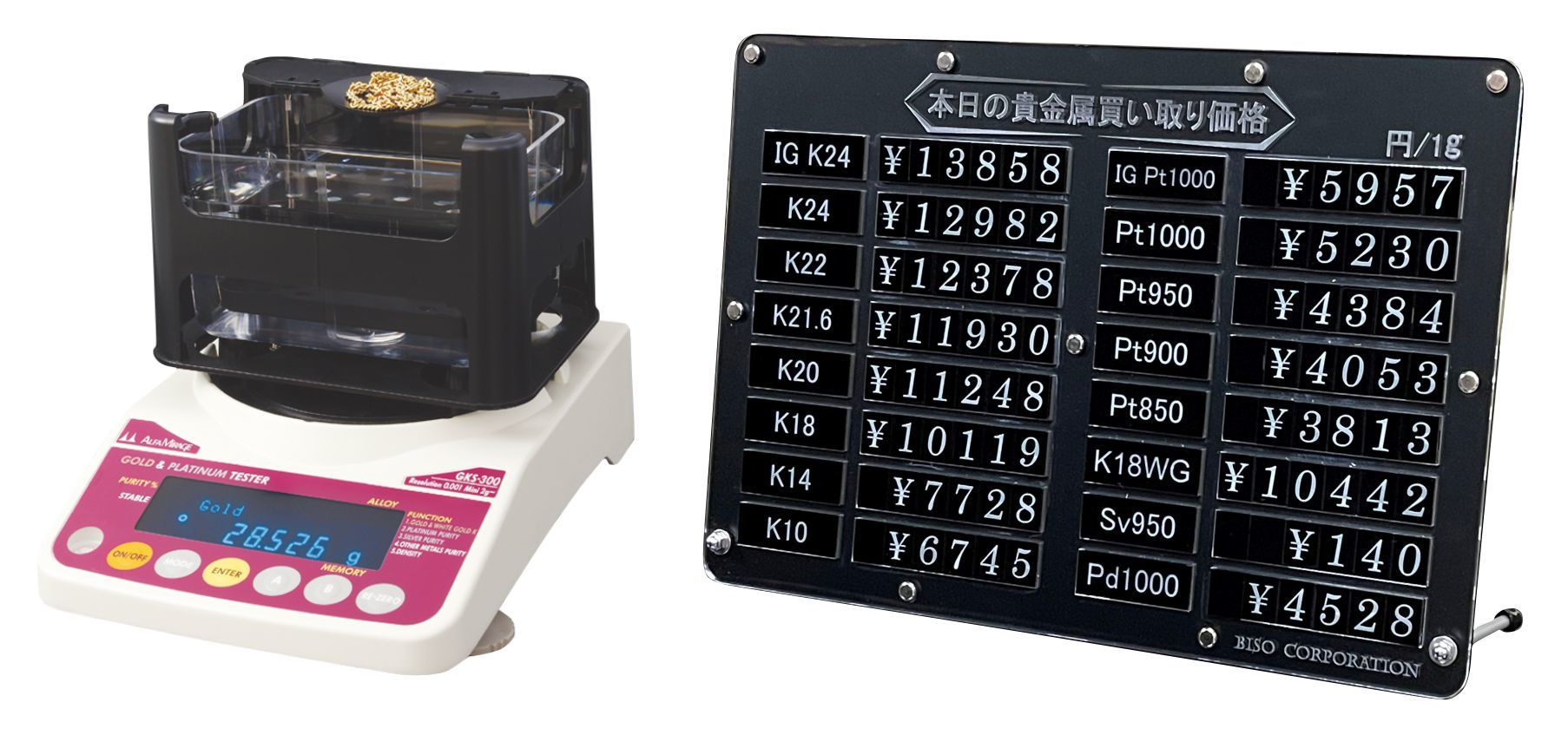 信頼のある貴金属テスターと買取りプライスボードのお得なセット販売です。