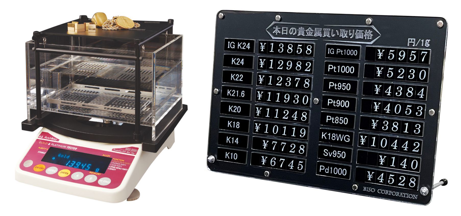 信頼のある貴金属テスターと買取りプライスボードのお得なセット販売です。