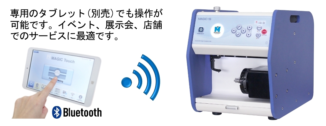卓上自動彫刻機、マジック MAGIC-5S タブレットワイヤレス対応 指輪彫刻、平面彫刻、写真彫刻まで可能です。別売の専用タブレットにてワイヤレス操作が可能です。 |