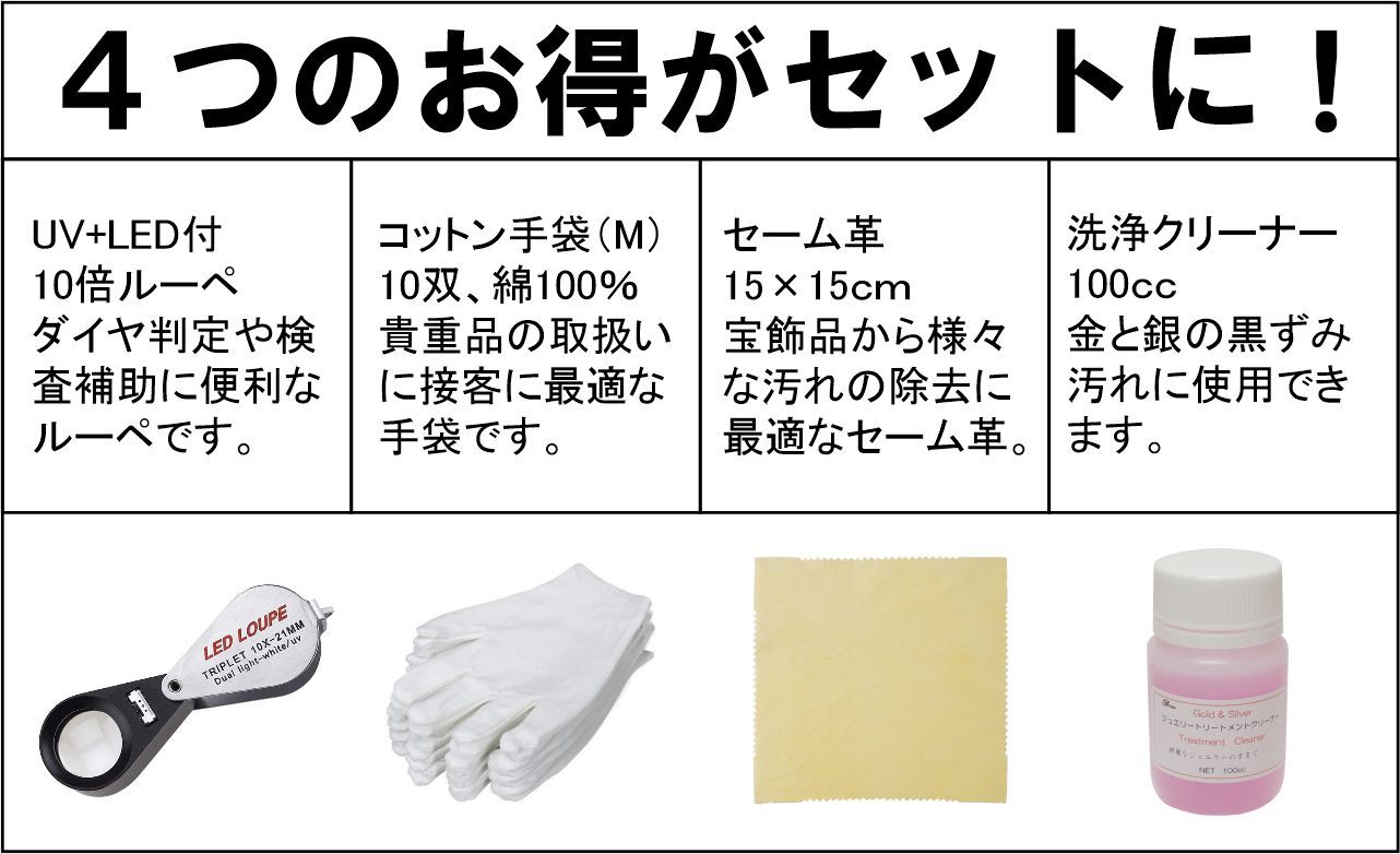 | 接客手袋各種 ジュエリー、時計、バックなどの貴重品の取り扱いに最適な手袋各種です。 | 接客トレイ 合皮レザー張りの高級感がある接客トレイです。 サイズ/S、L カラー/ホワイト、ブラック | 宝石鑑定ルーペ各種 ジュエリーの観察、判定補助、精密パーツの検査、検品作業などに使用できます。 |