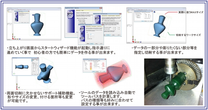 対話形式で加工手順を進められるウイザード機能があるので、初心者の方にも最適です。等高線加工の場合、緩斜面に補間パスを生成することも可能。3次元加工に加えて彫刻加工も可能になります。