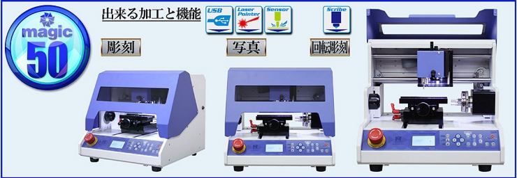 Magic50は指輪、平プレートなどに迅速かつ容易に、しかも美しく彫刻することができ、ネックレスやIDプレートなどの製作にも有効です。コンパクトデザインで、設置場所を選びません。操作を容易に行うための設計がされていますので、誰でも簡単に高品質な彫刻が可能です。付属のペン固定用治具を使用すれば、ボールペン等の棒形状のものにも刻印が可能です。