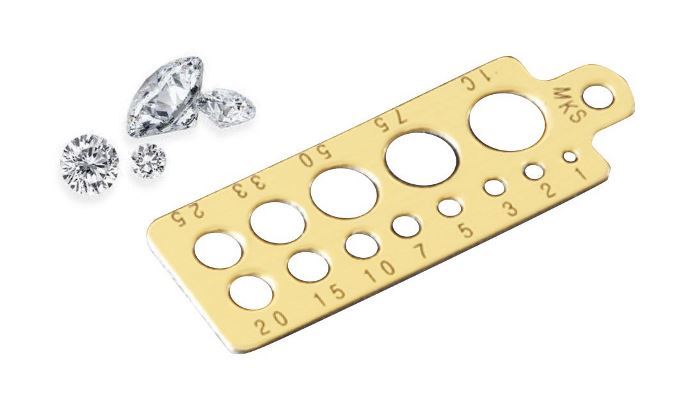 各大きさの穴を、爪止めされたダイヤモンドに合わせて大きさを推定するゲージです。